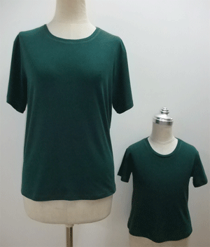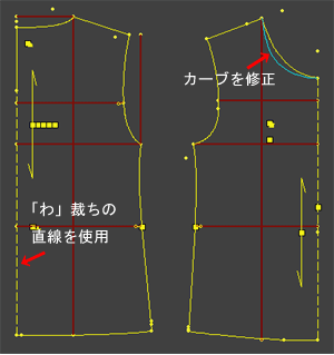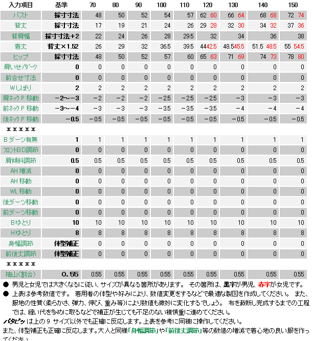 体型補正にも正確に対応します。 補正の操作はマニュアルをご覧ください。 生地の伸び具合で「ゆとり」の数値は変わります。 下表は一般的なTシャツの伸びをイメージした入力表です。 あまり伸びないニットでは、「ゆとり」は数センチプラスした数値を入力してください。 「肩傾斜調節」の「0.5」は、ドロップスリーブとしての肩のゆとりです。この操作で動き易い服を作ることができます。 ![]() 子供はよく動きます。 動き易い服が望ましいです。 でも、形は崩したくない。 きれいなラインでおしゃれな服を作りたいですね。 子供の採寸は結構難しいものです。 よく動き正確に測れません。 ネックラインについて、大人ではこのデザインの場合はそのまま着脱ができますが、子供は身体に対する頭の割合が大きいため、着脱ができないことがあります。 パタピッ はソフトですから、数値操作で体型に合った服を作ることができます。 ![]() 実行ボタンを押すと下の製図が画面に現れます。 ![]() 前身頃のネックラインを修正します。 後中心は「わ」裁ちの直線を使用しましょう。 ![]() ![]() ネックラインに1cm幅のリブを付けて仕上げます。 写真のTシャツは共地をリブ代わりに縫合しました。