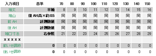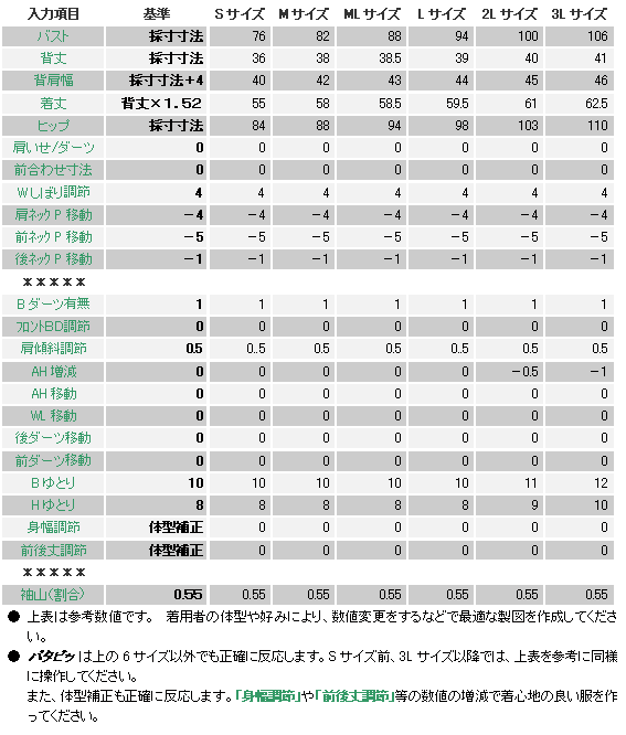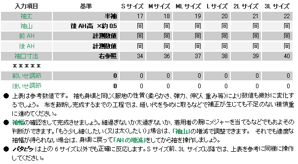 前後身頃のアームホールを測り、袖ソフトに入力すると 身頃にぴったりの袖ができ上がります。 ![]() ![]() 実行ボタンを押すと下の袖製図が画面に現れます。 ![]() このデザインの袖幅は、Sサイズで約34cm、M 37cm、ML 40cm、L 42cm、2L 44cm、3L 46cmが程よいでしょう。 70サイズ 23.5cm、80サイズ 24cm、90サイズ 24.5cm、100サイズ 25cm、110サイズ 25.5cm、120サイズ 26cm、130サイズ 28cm、140サイズ 30cm、150サイズ 33cmが程よいでしょう。 「袖山」の微調整で袖幅を調整することができますので、コンマ単位で数値を変更し、理想の袖を獲得してください。 |