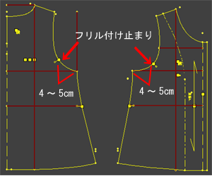 アームホールの脇点から4〜5cmの位置をフリル付け止まりとします。