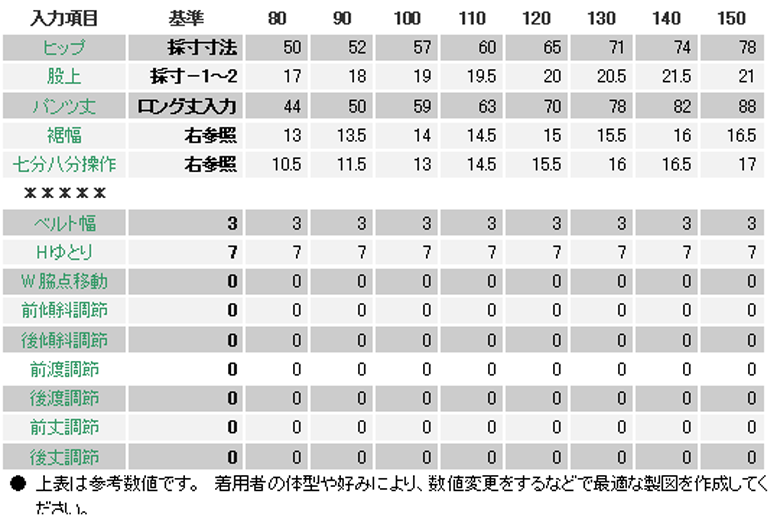 参考として、80〜150サイズの入力数値を表にしましたが、細い子、体格の良い子は一人一人の採寸寸法を入力して操作しましょう。 特に「ヒップ」は本人のサイズを入力しましょう。 ヒップが窮屈になり過ぎてはいけませんので注意が必要です。
