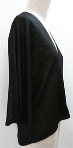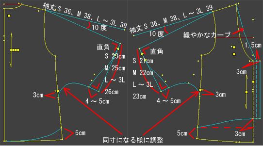 袖付けがない、身頃続きの五分袖。 縫製は縫いやすく初心者にもお勧めです。 前中心にワンタック。 流行っていますね。 ![]() ![]() ドルマンスリーブの部分は、下記で説明する様に自分で作図しなければいけませんが、その前の前後身頃の操作はパタピッ を使ってバランスの整った身頃を製図してください。 製図解説の書物ではこの様な製図は「囲み製図」として解説している物が多いです。 しかし、前後のバランスが整わない、体型補正ができないなど、心地よく着られる服に仕上がらない場合が多く問題でした。 パタピッ は最初の身頃製図の段階でバランスが整います。 体型補正もこの段階で行っておけば誰が着られても着心地良く仕上がります。 生地を変えると、こんな感じ。。。 上の白は、少し固めの生地、下の黒は、柔らかい生地で作りました。仕上がり感が変わります。 ![]()