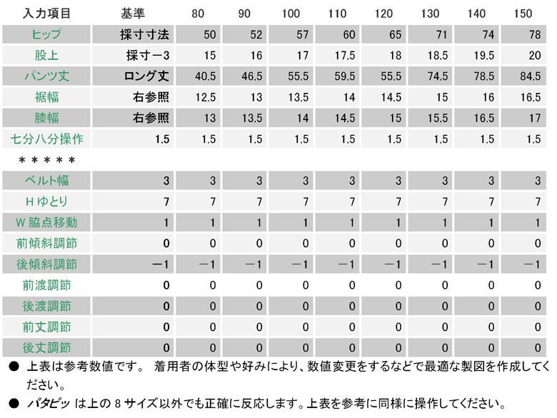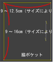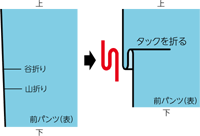 「七分八分操作」で1.5と入力したのは、膝にタックを入れることで裾が落ちてきますので、その分量を考慮しました。 ![]() 実行ボタンを押すと下の製図が画面に現れます。 ![]() ベルト通しは、下図を参考に。 前パンツは、前中心線の辺りに、後パンツは、後中心と、脇から3cmほど内側に、、、 幅1cm、長さ4cmのものを付けます。 前の膝辺りでタック(1.5cm)分量開きますので、その分、前パンツの丈を1.5cm長くしましょう。 後フラップは飾りフラップです。 正式なポケット(袋の付くもの)を製作しても構いません。 ![]() 各ポケットのサイズは下記を参考にしてください。 ![]() 後飾りフラップは、下図を参考にしてください。 ![]() ![]() 前パンツの膝辺りのタックは、下図の様に畳んで、後パンツと縫合してください。 ![]() |