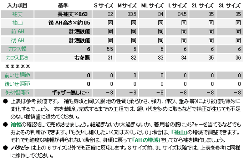 前後身頃のアームホールを測り、袖ソフトに入力すると 身頃にぴったりの袖ができ上がります。 ![]() 実行ボタンを押すと左下の袖製図が画面に現れます。 3つのカフスが画面に現れますが、「カフス(丸)」を使用します。 → ![]() このデザインの袖幅は、Sサイズで約38cm、M 41cm、ML 43cm、L 45cm、2L 46cm、3L 47cmが程よいでしょう。