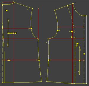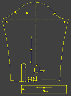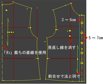 前中心の左に、前合わせと同寸の線を引き「前立て」とします。 見返し線は不要となりましたので消します。