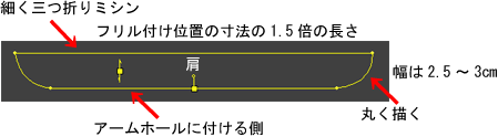 アームホールの脇点から4〜5cmの位置をフリル付け止まりとします。