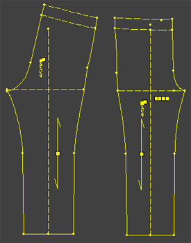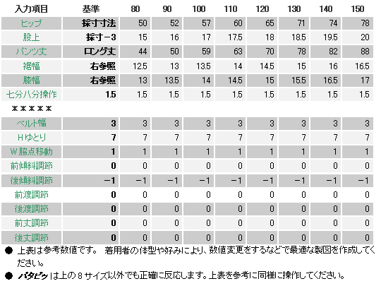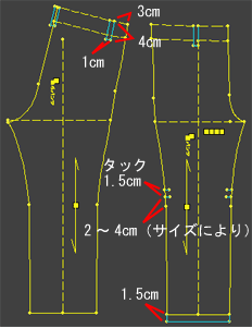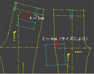 「七分八分操作」で1.5と入力したのは、膝にタックを入れることで裾が落ちてきますので、その分量を考慮しました。 ![]() 実行ボタンを押すと下の製図が画面に現れます。 ![]() ベルト通しは、下図を参考に。 前パンツは、前中心線の辺りに、後パンツは、後中心と、脇から3cmほど内側に、、、 幅1cm、長さ4cmのものを付けます。 前の膝辺りでタック(1.5cm)分量開きますので、その分、前パンツの丈を1.5cm長くしましょう。 後フラップは飾りフラップです。 正式なポケット(袋の付くもの)を製作しても構いません。 ![]() 各ポケットのサイズは下記を参考にしてください。 ![]() 後飾りフラップは、下図を参考にしてください。 ![]() ![]() 前パンツの膝辺りのタックは、下図の様に畳んで、後パンツと縫合してください。 ![]() |